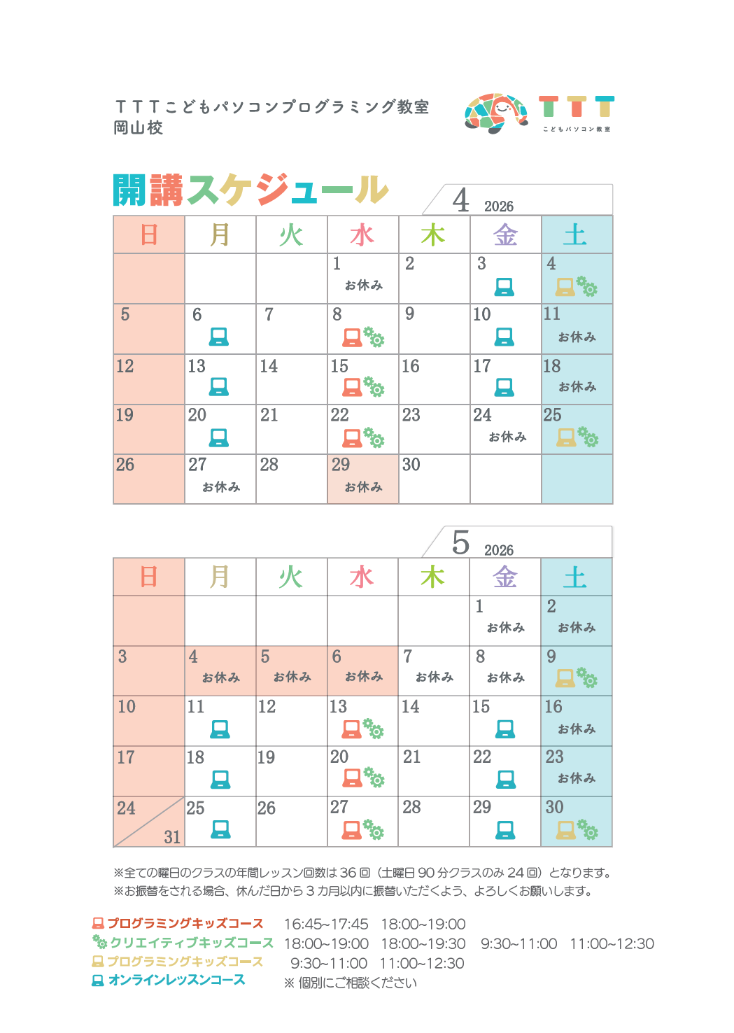※すべてのクラスは年間36回のレッスンとなります。